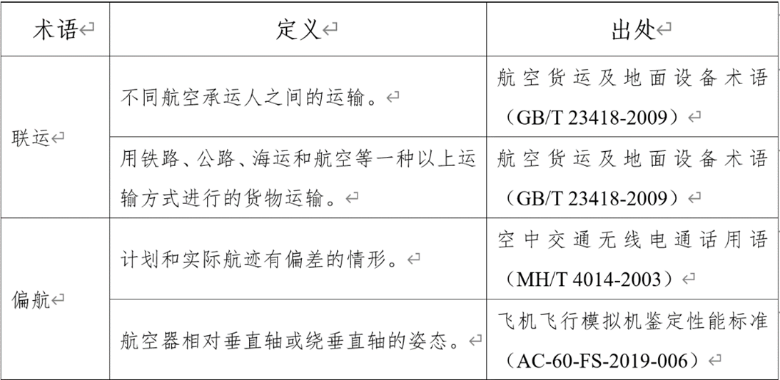 有的词条名称一致,由于适用领域不同(如运输航空和通用航空、客运和货运、不同业务部门),造成所指概念不完全相同。造成此种情况重要原因是发文单位不同,未考虑相关术语在民航中总体适用性。在汇编中,课题组将这些术语归为同一词条,但保留了各自语境下的定义。