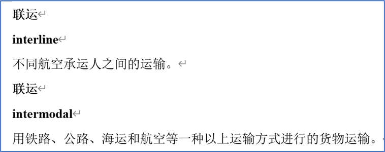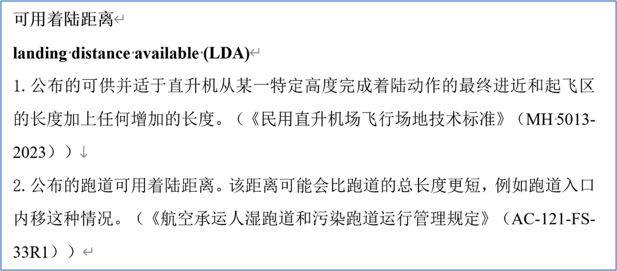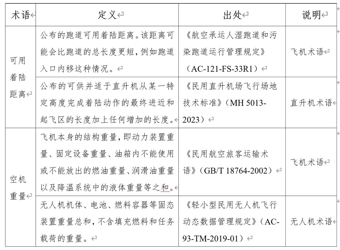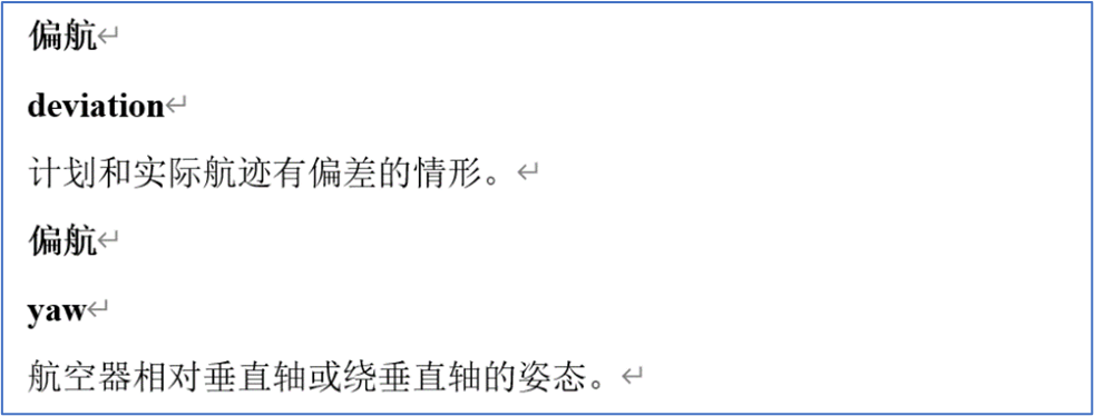 为适应中国民航工作需要,并在参考《航空科学技术名词》词条呈现形式基础上,课题组确定尽可能完整呈现中文术语、英文术语、英文缩略语和定义。课题组大量参照了国际民航组织、欧盟、美国、加拿大、澳大利亚等国际组织/地区/国家的航空立法文件,以及国内外各类航空术语词典,对词条的英文术语进行了补全,采用了“中文术语+英文术语+中文定义”的呈现方式,样式如下: