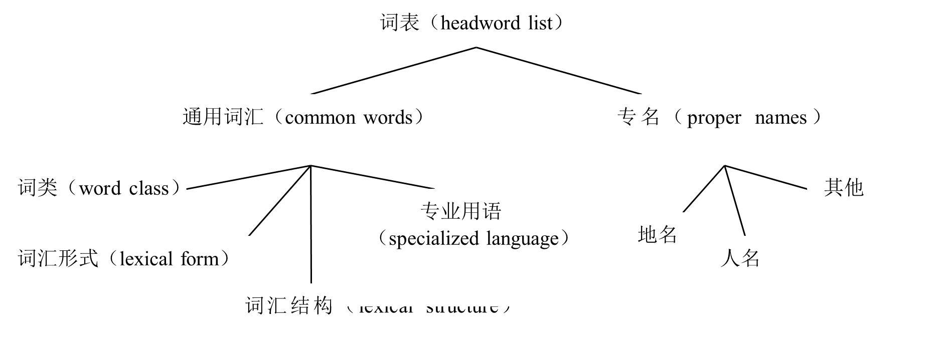 可以看出,阿特金斯与朗德尔认为语文词典的宏观结构中应该包含两个基本模块——通用词汇与专名,对应的就是密尔所说的通名与专名。在通用词汇之下,阿特金斯与朗德尔分出词类、词汇形式、词汇结构与专业用语四个子类型。这是词目确立时需要考虑的第二个层次。问题是,第二层次的四个分类——词类、词汇形式、词汇结构与专业用语并不在一个逻辑层面上。词类、词汇形式、词汇结构分别描写了通用词汇的语法属性、派生与屈折变化以及词汇单位的组成形式,是对语言单位基本属性的分类,而专业用语则与学科领域相关,是从使用方面着眼的。通常情况下,学界会把通用词汇、专业术语与专名并列,置于同一层面。但在阿特金斯与朗德尔的图中,专业用语是作为通用词汇的下位分类出现的。这体现了英语语文词典编纂者对通用词汇与专业词汇关系的现代定位。换言之,在现代英语语文词典中,专业用语是认为是通用词汇的一个不可或缺的部分,必须包含在词表之中。传统上,汉语与学界倾向于把通用词汇等同于语文性词汇,并把专名与专业术语合在一起,统称为百科性词汇。这一种分类方法与谢尔巴关于“语文词典”与“百科词典”的分类吻合,也是本研究中所采用的分类方法。