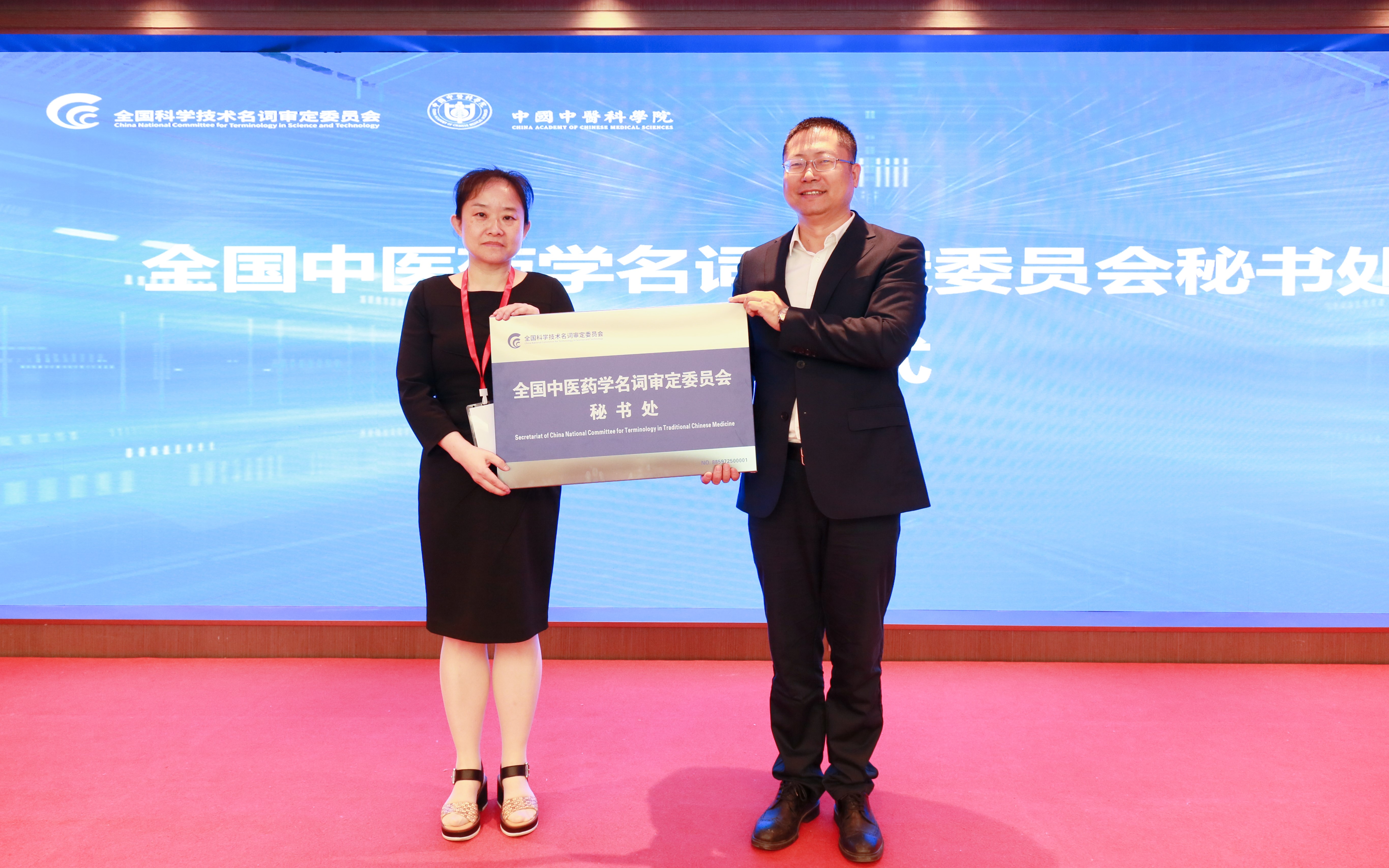 全国科技名词委事务中心医学专项办主任张玉森宣读第四届中医药学名词审定委员会名单。随后举行了新一届委员会秘书处授牌仪式,裴亚军主任向全国中医药学名词审定委员会秘书处授牌,中国中医科学院中国医史文献研究所副所长甄艳接牌。并为第四届全国中医药学名词审定委员会组成人员颁发聘书,由裴亚军主任为黄璐琦院士颁发主任委员聘书,裴亚军主任与黄璐琦院士共同为委员会顾问专家、副主任委员、委员及秘书长、副秘书长颁发聘书。