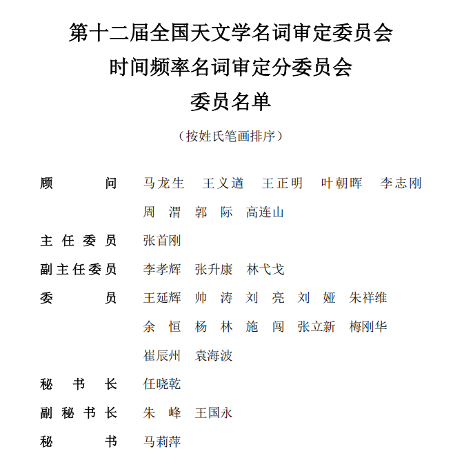 全国天文学名词审定委员会副主任委员余恒宣读了本届时间频率名词审定分委员会组成名单。分委员会设主任1名,副主任3名,委员12名,顾问8名,秘书处4名,共计28人,由全国科学技术名词审定委员会聘任,每届任期五年。会议为本届时间频率名词审定分委员的主任委员、顾问、委员及秘书颁发了聘书。