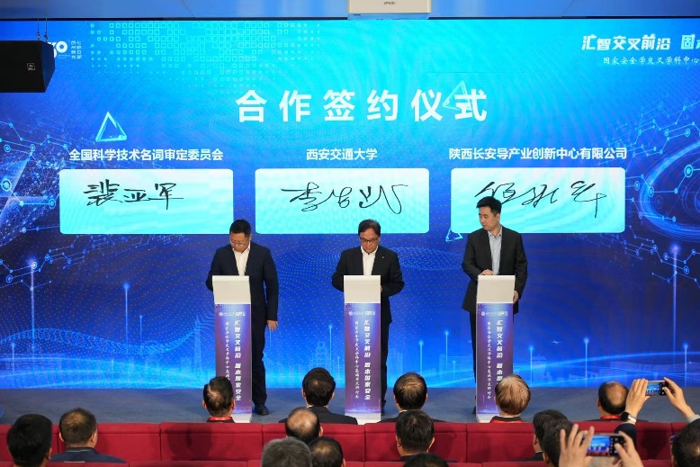 全国科学技术名词审定委员会专职副主任、事务中心主任裴亚军,西安交通大学国家安全学交叉学科中心首席科学家李生斌教授共同签署秘书处建设协议。西安交通大学校长张立群出席仪式并见证签约。
