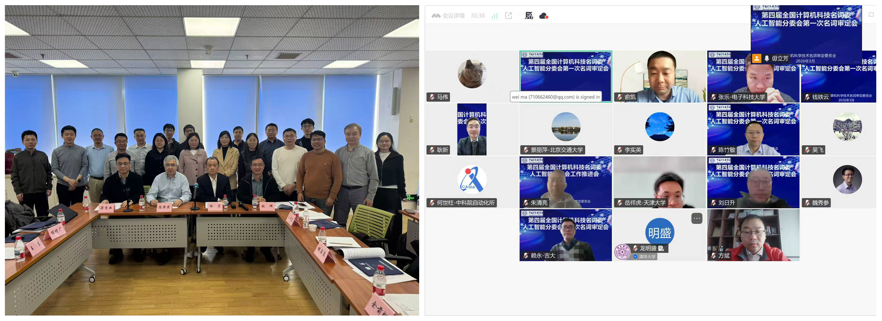 2026年3月30日,第四届全国计算机科学技术名词审定委员会人工智能分委会第一次审定工作会议以线上线下相结合的方式召开,线下会场设在中国科学院计算技术研究所。计算机名词委主任委员梅宏院士莅临会议。计算机名词委副主任委员兼人工智能分委会主任委员、中国科学院计算技术研究所陈熙霖研究员,分委会顾问、山西大学梁吉业教授,分委会副主任委员、北京交通大学景丽萍教授,审定委员会、编写委员会50余位专家出席会议。全国科技名词委事务中心副主任张晖、审定业务四处处长刘金婷、副编审余前帆、综合处副处长李侃参加会议。