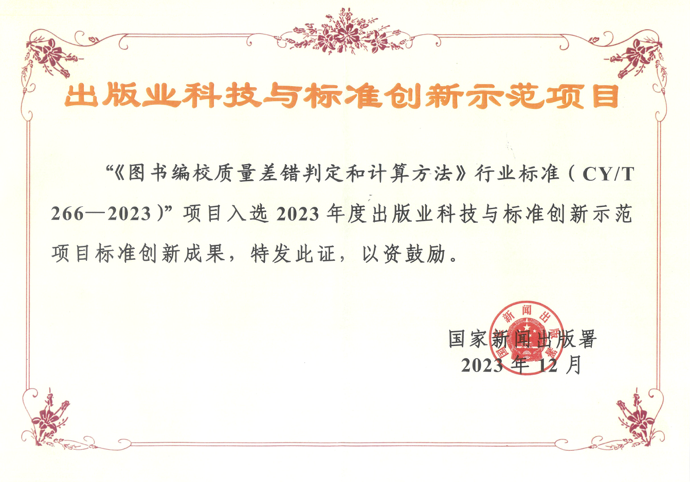 出版行业标准《图书编校质量差错判定和计算方法》入选2023年出版业科技与标准创新示范项目标准创新成果