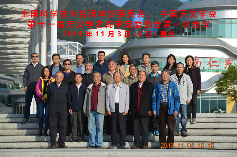 全国科学技术名词审定委员会、中国天文学会第十一届天文学名词审定委员会第一次会议于2019年11月3日至6日在贵州省平塘县天文小镇举行。本届委员会委员(以姓名笔画为序)马月华、王玉民、方成、卞毓麟、刘炎、杨大卫、何香涛、余恒、邹振隆、邵正义、赵晖、赵永恒、黄天衣、萧耐园、崔辰州、谢懿,特邀代表南京大学陈阳、紫金山天文台史建春、国家天文台张博,台北市天文协会陶蕃麟先生,委员会秘书李珊珊及全国科技名词委事务中心刘金婷等出席会议。