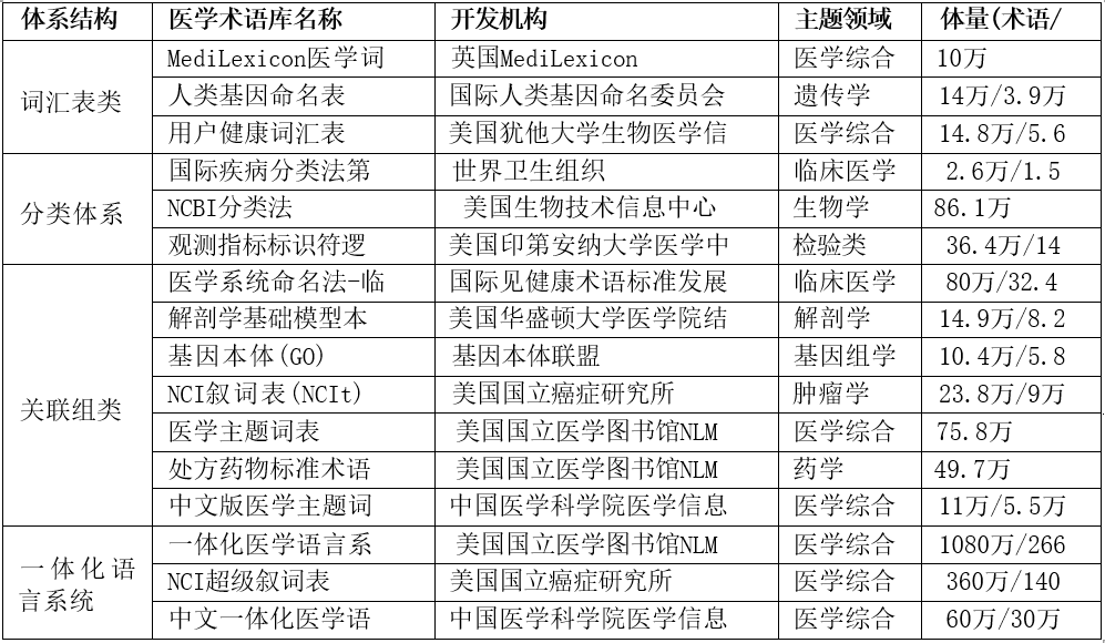 表 1 主要医学术语标准概览