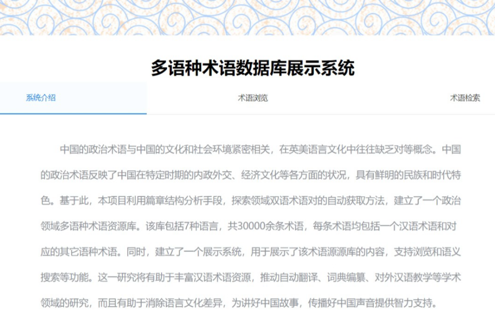 (3)政治领域多语种术语数据库展示系统。本项目建立了一个多语种术语数据库展示系统,数据来源于已抽取的政治领域多语种术语对。