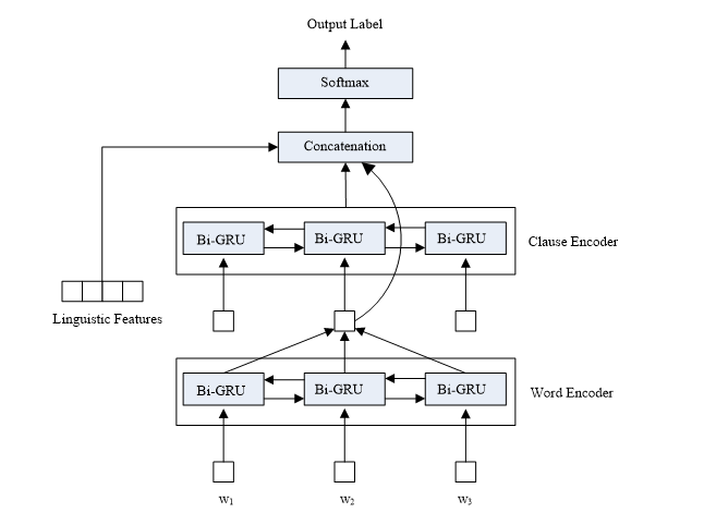(5)社会文本分析。情绪原因分析是社会文本分析研究的重要内容之一。传统分析模型利用标点符号将句子划分成若干子句,然后分别判断子句是否为原因句,然而原因可能由多个子句构成,采用上述方法难以抽取完整的原因句。事实上,原因句往往包含在基本篇章单元中,为此,本研究采用了篇章分析模型,将句子划分为若干基本篇章单元,然后再识别每个单元是否为原因。模型结构如图7所示。