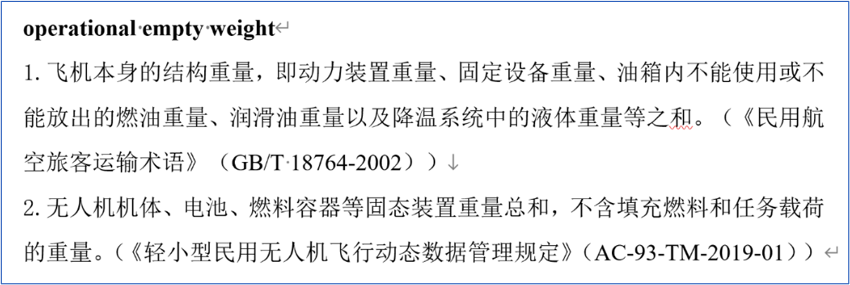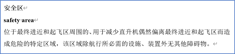 为适应中国民航工作需要,并在参考《航空科学技术名词》词条呈现形式基础上,课题组确定尽可能完整呈现中文术语、英文术语、英文缩略语和定义。课题组大量参照了国际民航组织、欧盟、美国、加拿大、澳大利亚等国际组织/地区/国家的航空立法文件,以及国内外各类航空术语词典,对词条的英文术语进行了补全,采用了“中文术语+英文术语+中文定义”的呈现方式,样式如下: