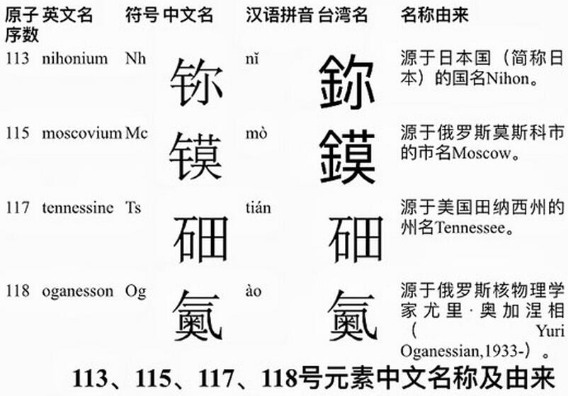 5月9号,中科院公布了这4个新元素的中文名字,分别是“钅尔”(nǐ)、“镆”(mò)、“(左石右田)”(tián)、“(上气下奥)”(ào),其中两个字为新造字。 全国科技名词审定委员会 专职副主任 裴亚军说: “全国科学技术名词审定委员会与国家语言文字工作委员会密切配合,在广泛征求有关专家意见的基础上,提出了113号、115号、117号、118号元素的中文定名,依次为“钅尔” “镆”、“石田”、“气奥”。其中的新造字得到国家语言文字工作委员同意,纳入国家规范用字。”