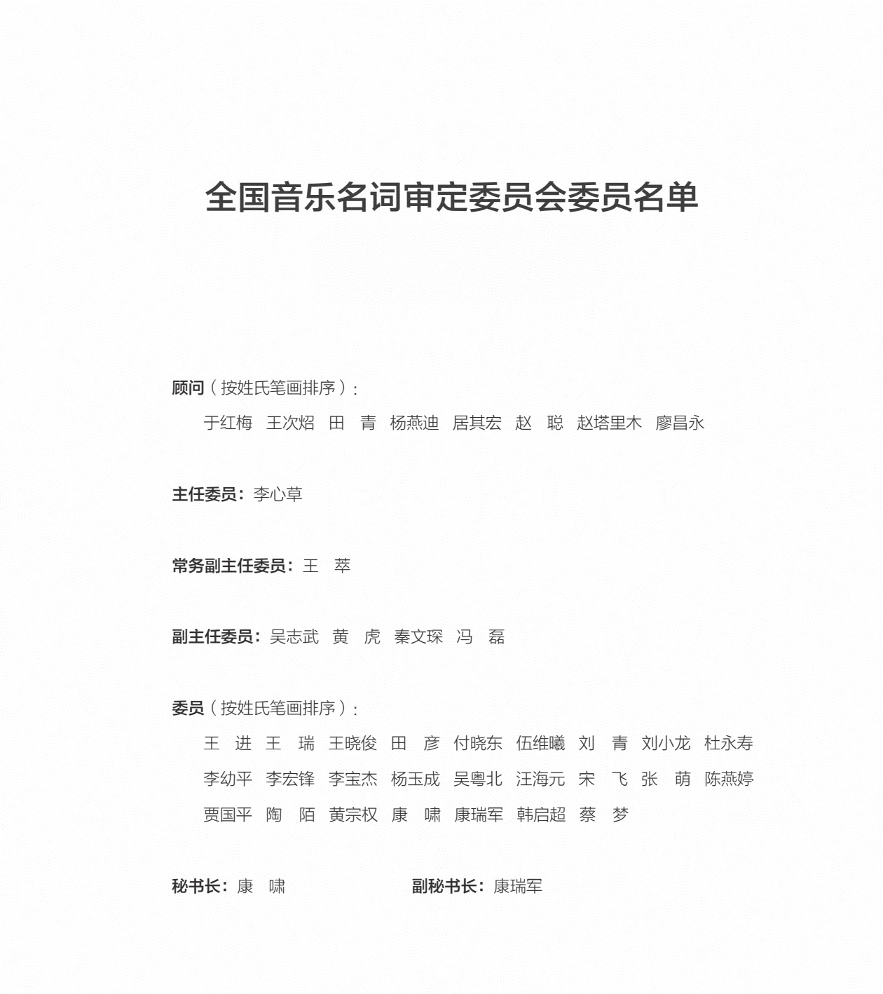 经过参会顾问、委员审议,会议一致通过了全国音乐名词审定委员会章程、音乐名词学科体系、名词审定分工安排及工作计划等系列文件。