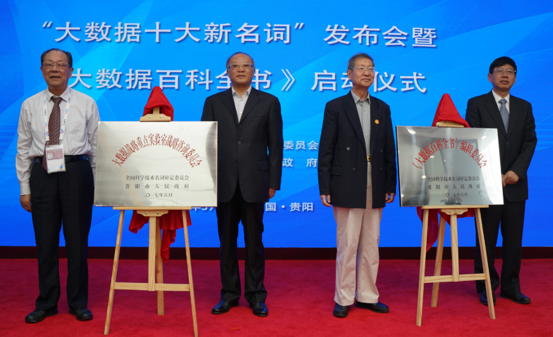 5月25日,“2017年中国国际大数据产业博览会”在贵阳召开。全国科学技术名词审定委员会联合大数据战略重点实验室召开“大数据十大新名词”发布会暨《大数据百科全书》启动仪式。中国人民解放军信息工程大学王家耀院士,中国科学院生物物理研究所陈润生院士,武汉大学遥感信息工程学院院长龚健雅院士,中国科学院国家天文台武向平院士,中国科学院北京基因组研究所方向东研究员,中国科学院国家天文台崔辰州研究员,全国科学技术名词审定委员会专职副主任裴亚军,贵阳市人大常委会主任李忠,贵阳市政协主席王保建,贵阳市委常委、副市长杨赤忠,贵阳市政府市长助理、贵州大学贵阳创新驱动发展战略研究院院长连玉明等出席了活动。