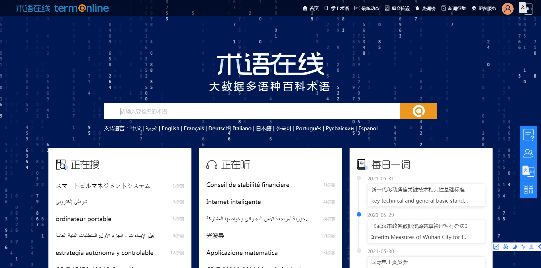 同时发布的“大数据多语种语言服务全球共享平台”,包括“数典云平台”“丝路数典通”“数典术语在线”“数典贵阳指数”“数典图书馆”“数典案例库” 六个多语种智能化分平台,面向全球提供公益的、普惠的多语种大数据知识服务。其中“数典术语在线”由全国科学技术名词审定委员会事务中心研发,为从事大数据相关研究和应用的用户提供术语检索、术语管理、术语提取与标注等多元化术语知识服务。