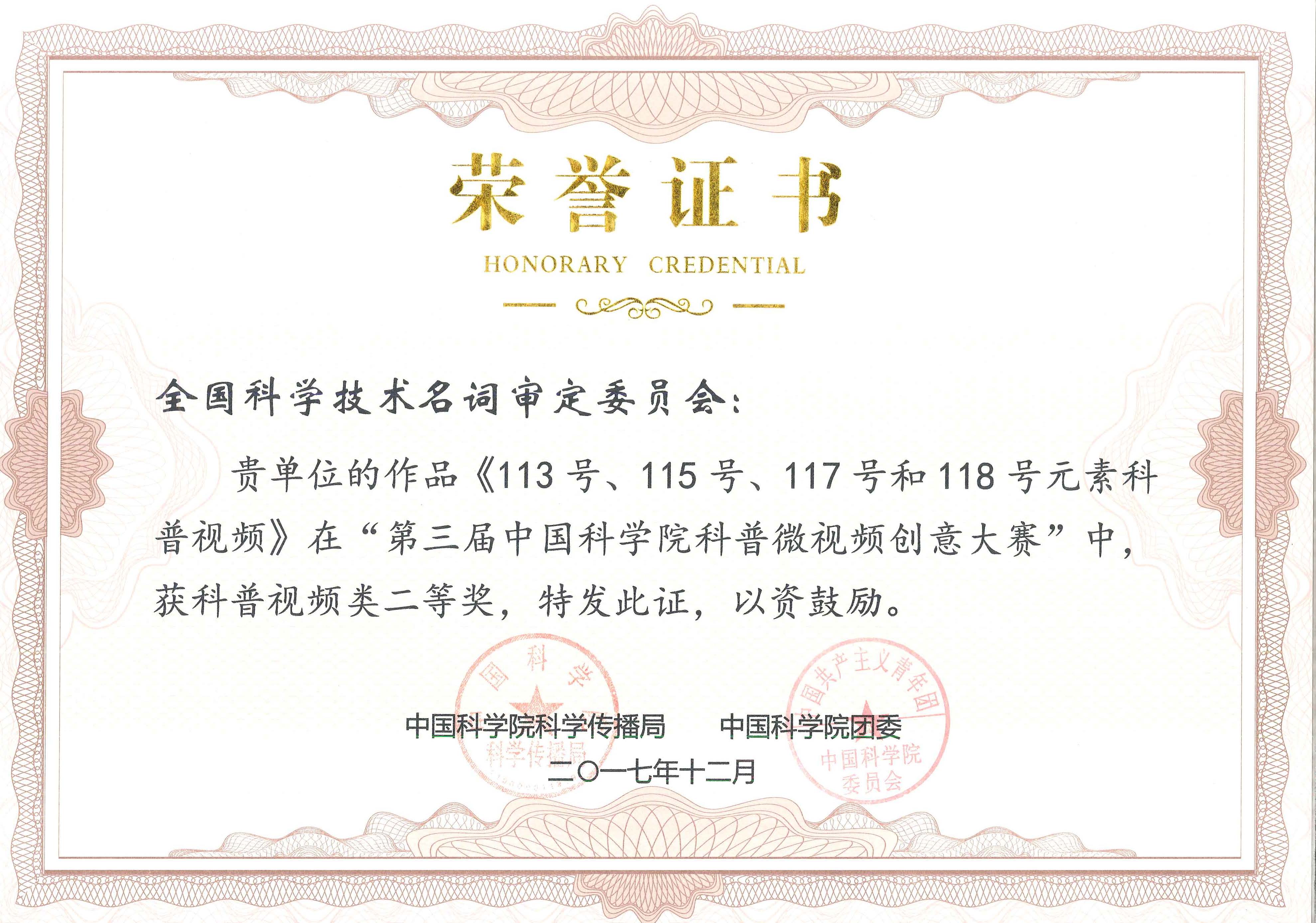 为了在全社会对113号、115号、117号、118号元素中文名进行普及和推广,全国科技名词委事务中心制作了《113号、115号、117号和118号元素科普视频》,并荣获第三届中国科学院科普微视频创意大赛二等奖。
