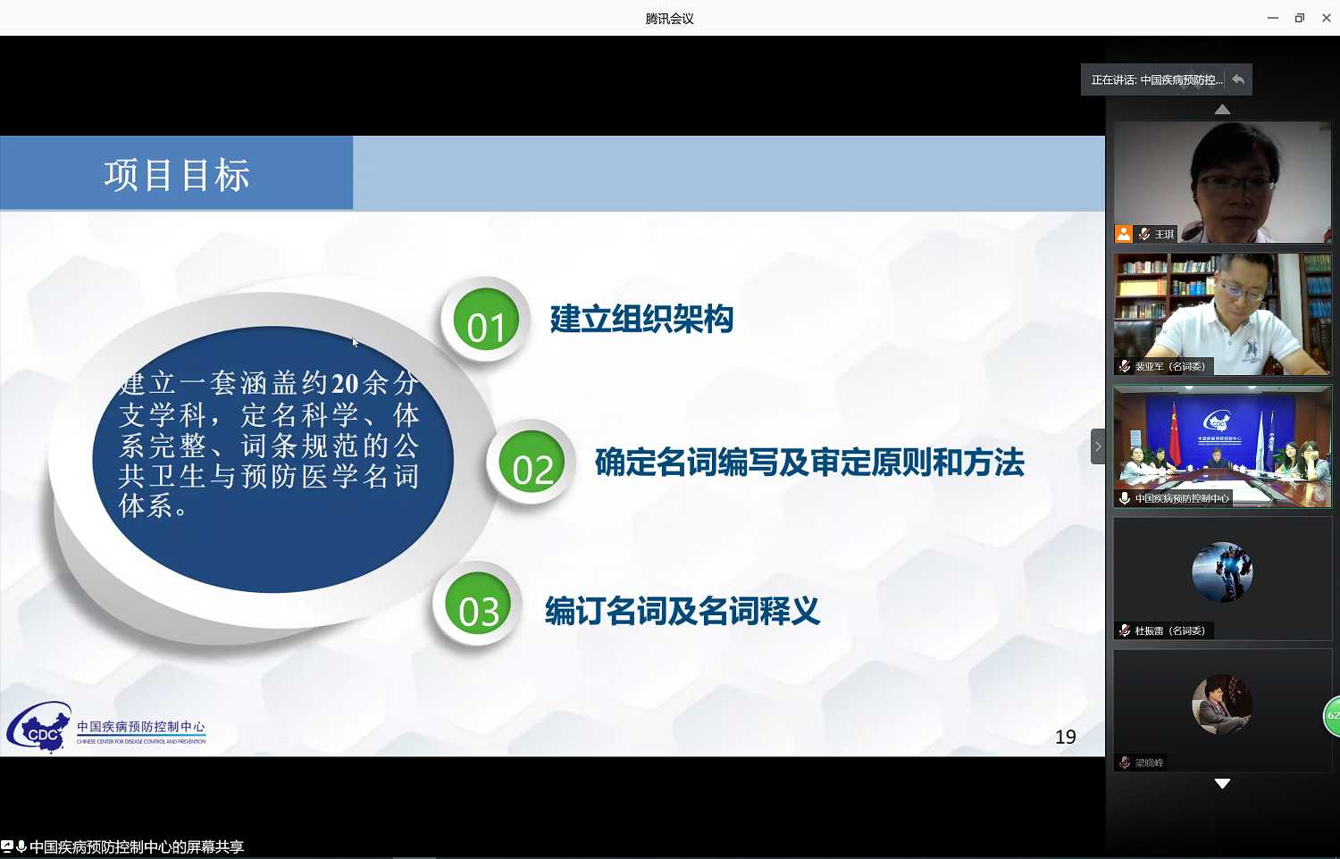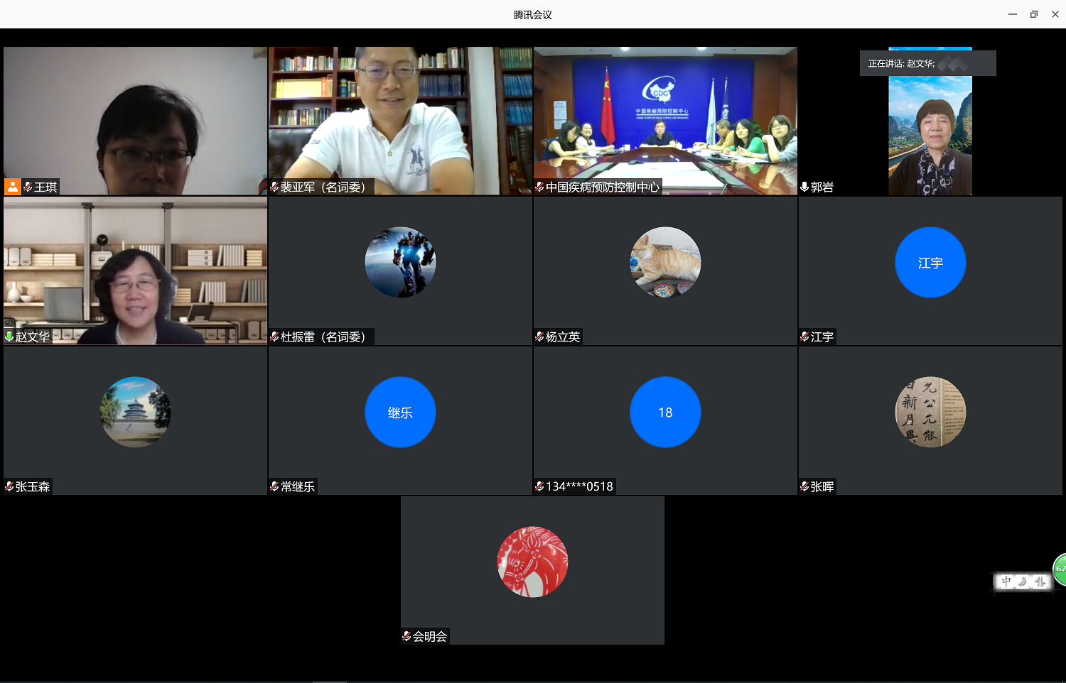 7月10日,全国科技名词委召开公共卫生与预防医学名词审定项目评审视频会议。公共卫生与预防医学名词审定项目评审组由国家卫生健康委疾控局常继乐局长、中华预防医学会秘书长梁晓峰研究员、中科院科学传播局领导班子成员徐雁龙、北京大学公共卫生学院郭岩教授、北京协和医学院公共卫生学院江宇教授、中华预防医学会慢病分会赵文华研究员、中科院文献情报中心科学计量中心主任杨立英研究员组成,其中郭岩教授为评审组组长。作为项目承担单位,中国疾控中心出席会议的专家有中国疾控中心副主任、研究生院执行院长刘剑君研究员,中国疾控中心教育处处长、研究生院副院长罗会明主任医师,流行病学办公室主任么鸿雁研究员、亓晓副研究员,中国疾控中心教育处马静副研究员、刘梦冉助理研究员。全国科技名词委专职副主任裴亚军、医学名词审定委员会秘书长张玉森、事务中心主任助理张晖、科研办主任王琪、科信部副主任杜振雷参加会议。会议由王琪主持。