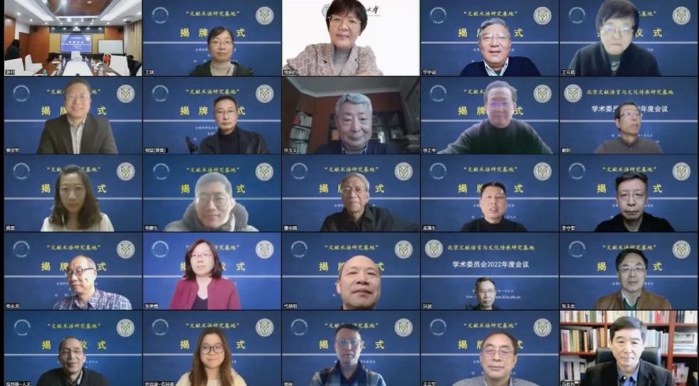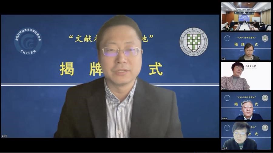 北京语言大学校长助理、人事处处长郁有学宣读了基地主任聘任决定,决定聘任魏兆惠教授为“文献术语研究基地”主任。全国科技名词委与北京语言大学共建的“文献术语研究基地”挂靠北京语言大学文学院,依托北京文献语言与文化传承研究基地进行建设。北京语言大学党委常委、副校长黄益方和北京语言大学校长助理、人事处处长郁有学在线上线下师生的共同见证下,为文献术语研究基地进行揭牌。