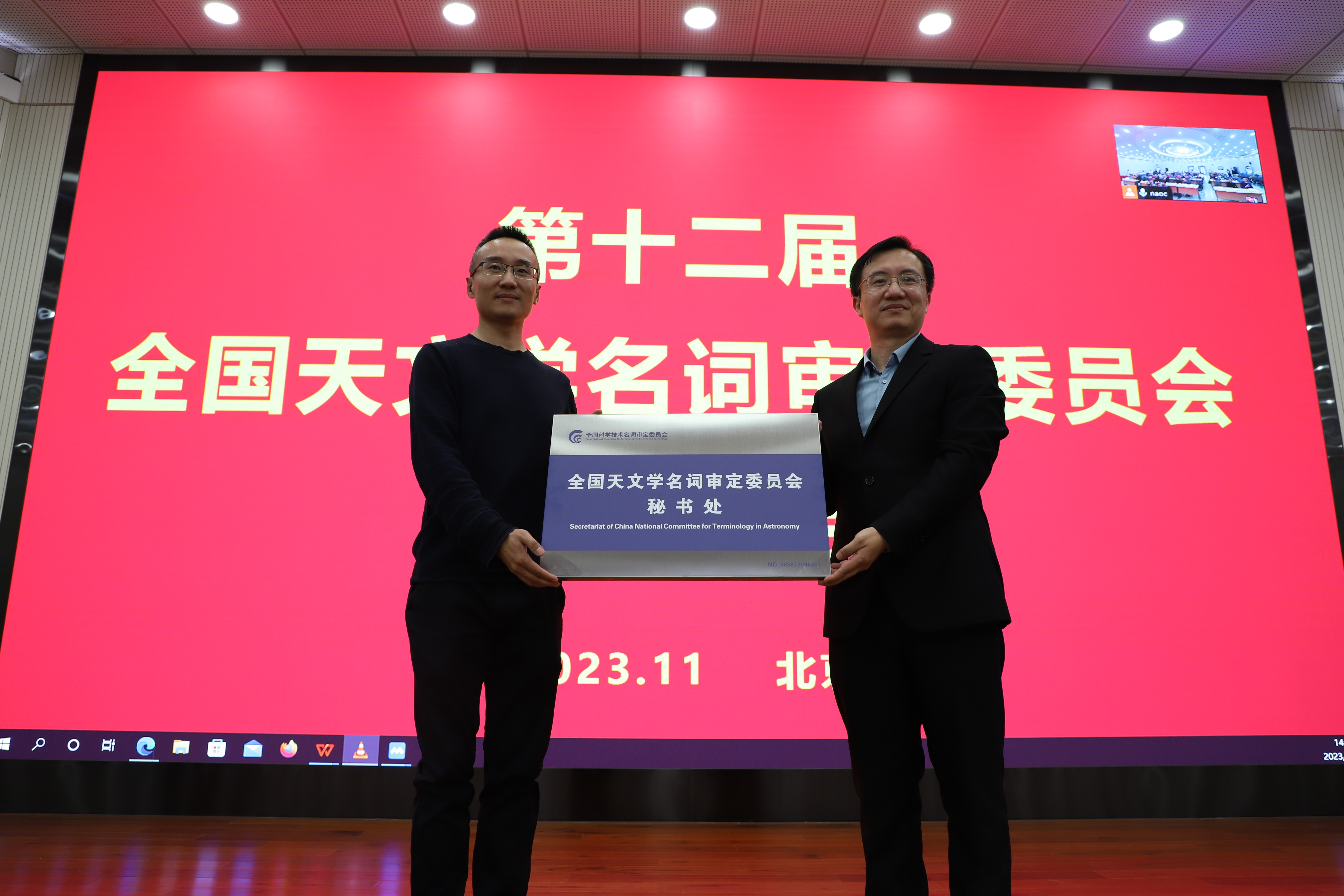 会上,全国科技名词委事务中心副主任张晖宣读了《关于同意开展天文学名词审定工作的复函》和《关于批准成立第十二届全国天文学名词审定委员会等机构的通知》。会议举行了第十二届全国天文学名词审定委员会秘书处共建协议签约仪式和授牌仪式。全国科技名词委专职副主任裴亚军与国家天文台副台长刘继峰在秘书处共建协议上签字。全国科技名词委事务中心副主任张晖将秘书处标牌授予国家天文台副台长赵公博。