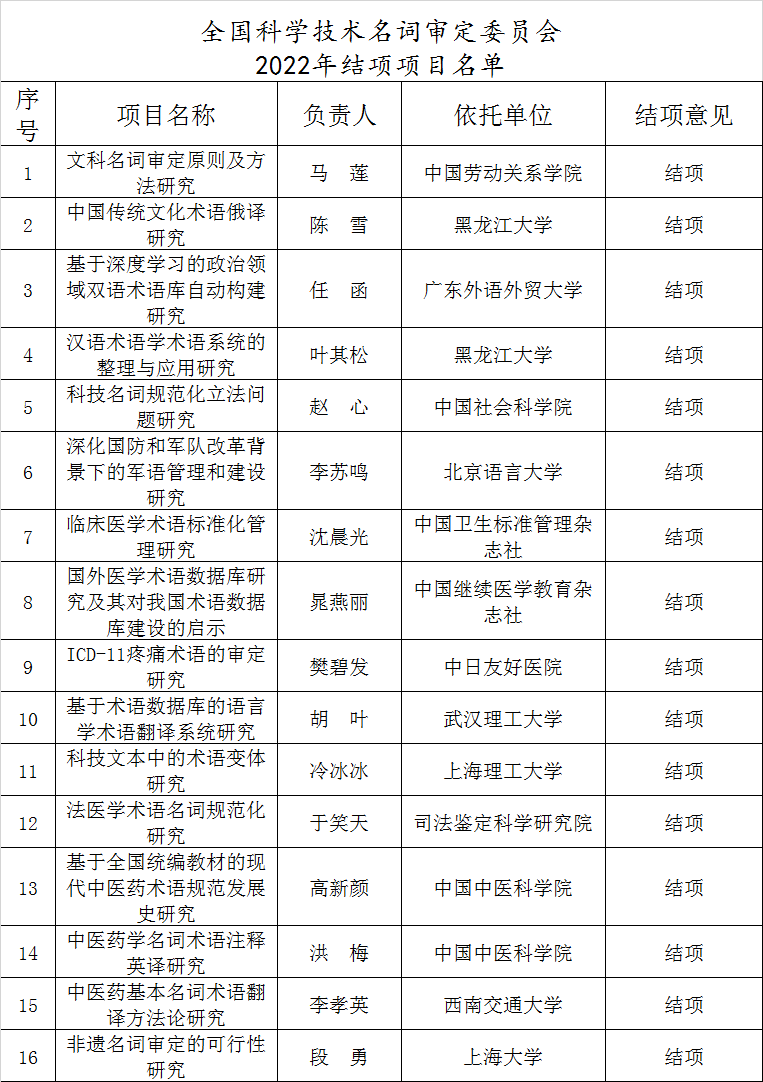 根据《关于开展全国科学技术名词审定委员会科研项目结项工作的通知》(科词委〔2021〕027号),全国科技名词委于近期组织开展了2022年科研项目结项集中鉴定,通过结项项目公示如下。